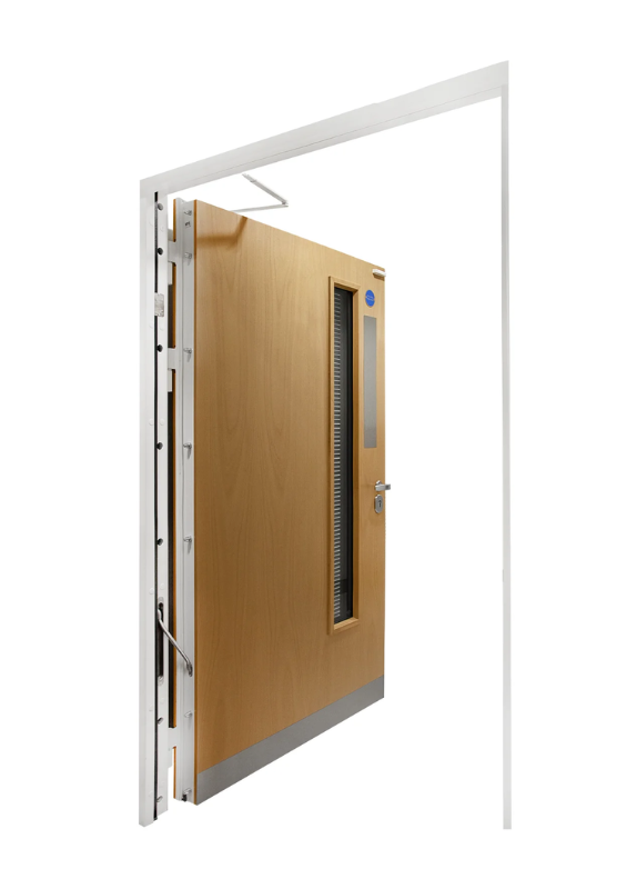 - Door core is composed of a steel sheet encased by two layers of grating. Even if one side is attacked, two layers of protection will remain.