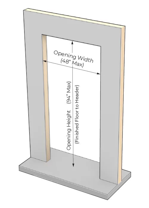 The door can fit in any wall opening up to 48″ in width and 94″ in height. See the technical documentation below for product sizing details.